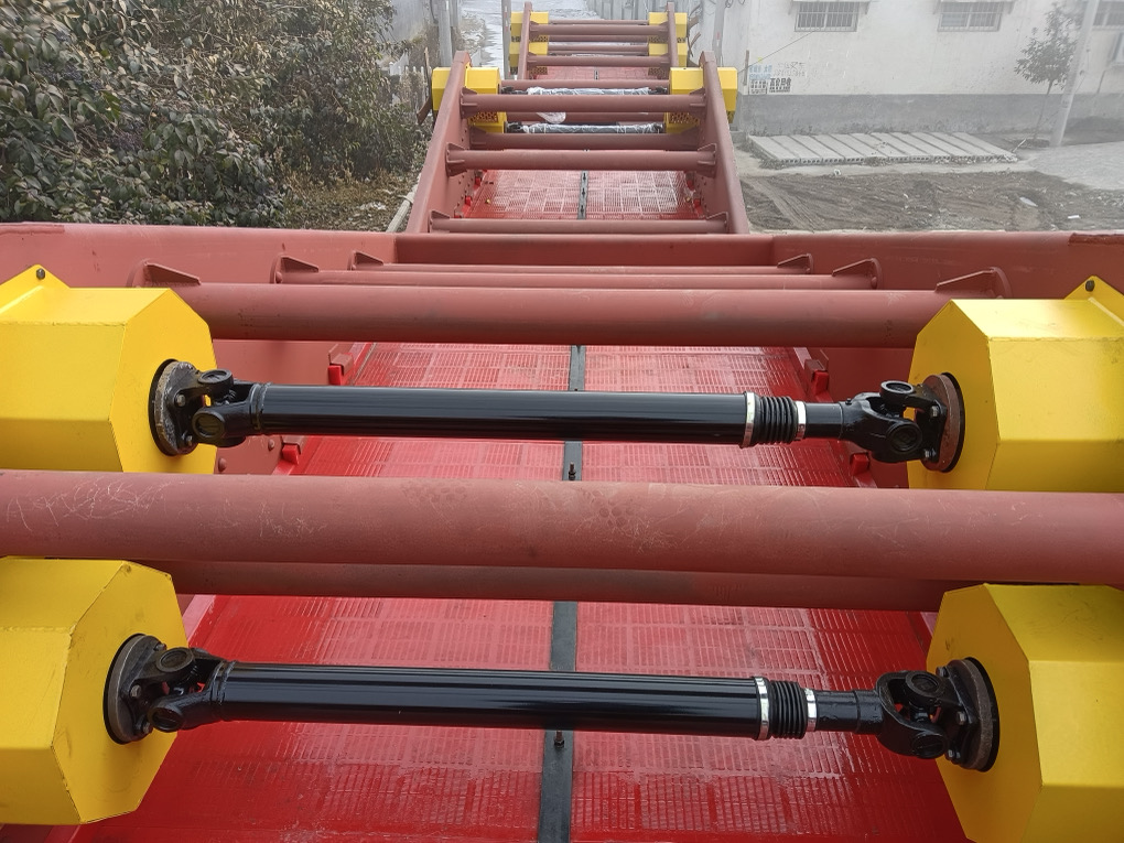 采用雙電機(jī)驅(qū)動(dòng)自同步技術(shù),激振器通過(guò)繞性聯(lián)軸器拖動(dòng),兩組激振器作同步反向旋轉(zhuǎn)時(shí),其偏心塊所產(chǎn)生的激振力在平行于電機(jī)軸線(xiàn)的方向相互抵消,在垂直于電機(jī)軸的方向疊為一合力,從而形成單一的沿振動(dòng)方向的激振力,其兩軸相對(duì)于篩面有一傾角,在激振力作用下使篩箱做往復(fù)直線(xiàn)運(yùn)動(dòng),物料在篩面上被拋起跳躍向前作直線(xiàn)運(yùn)動(dòng),同時(shí)V型設(shè)計(jì)的篩面結(jié)構(gòu)更佳的實(shí)現(xiàn)脫水效果。